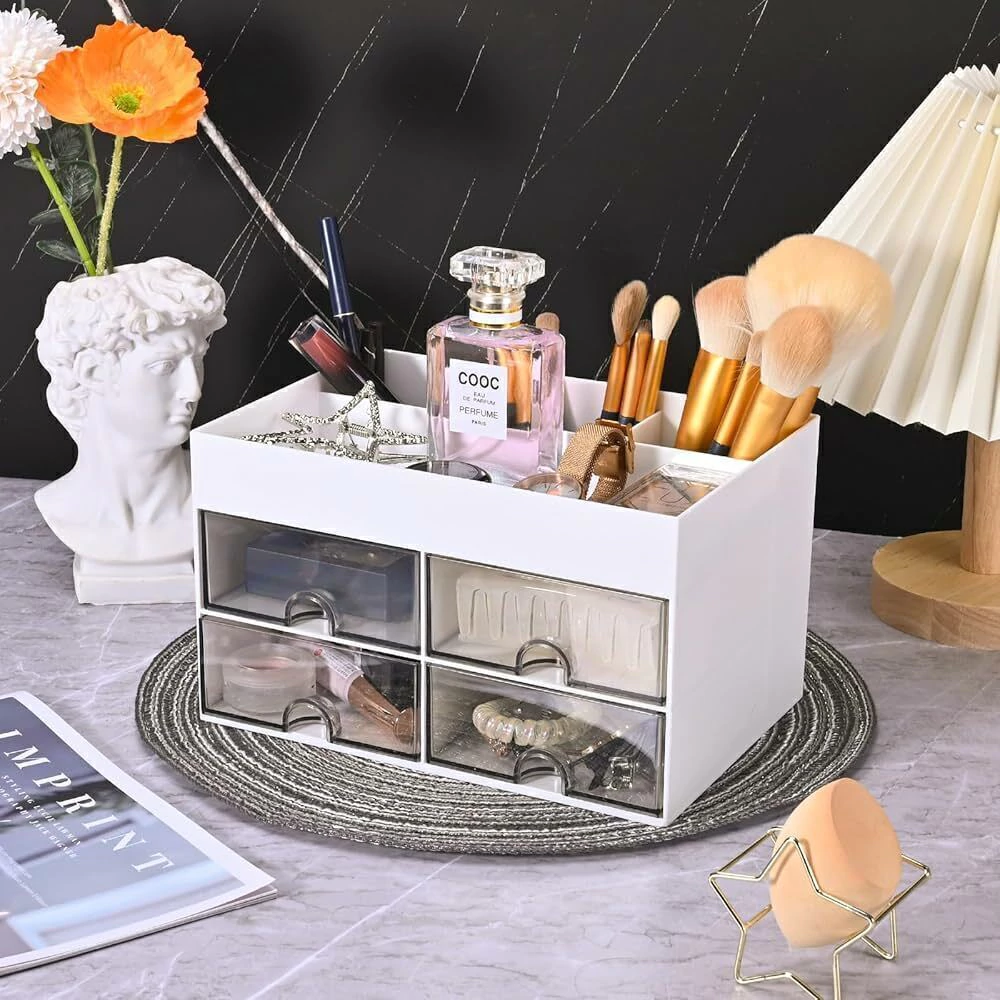 Fabricado en plástico y acrílico, mide 21 cm x 14 cm x 12 cm de alto y cuenta con 4 cajoncitos y 4 compartimentos para que tengas todos tus accesorios siempre a mano.