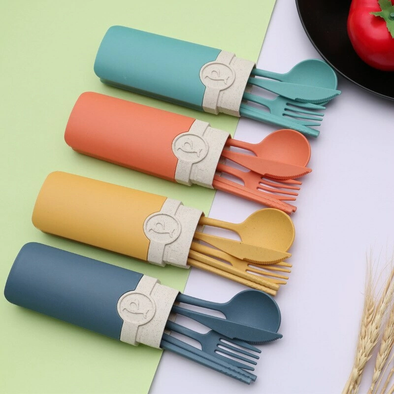 El set incluye: 1 tenedor, 1 cuchillo, 1 cuchara y palillos, todo elaborado en fibra de trigo, un material sostenible.